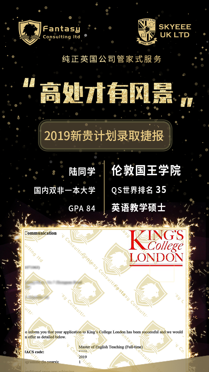但是这个名校可不好进,陆同学在大二时候的成绩维持在3.3左右,Fantasy在仔细分析了当前的情势后,决定以位于世界前十的伦敦大学学院,位于世界前30排名的伦敦国王学院,位于世界前70排名的伯明翰大学作为冲刺院校,并且接连也选择了英国前10,世界前100强的其他学府。通过Fantasy团队努力后,陆同学在申请的9所院校中拿到了8所大学的录取通知书,且在最初考虑的三所冲刺院校中,其中包括伦敦国王学院和伦敦大学学院全部斩获,陆同学决定入读伦敦大学学院。